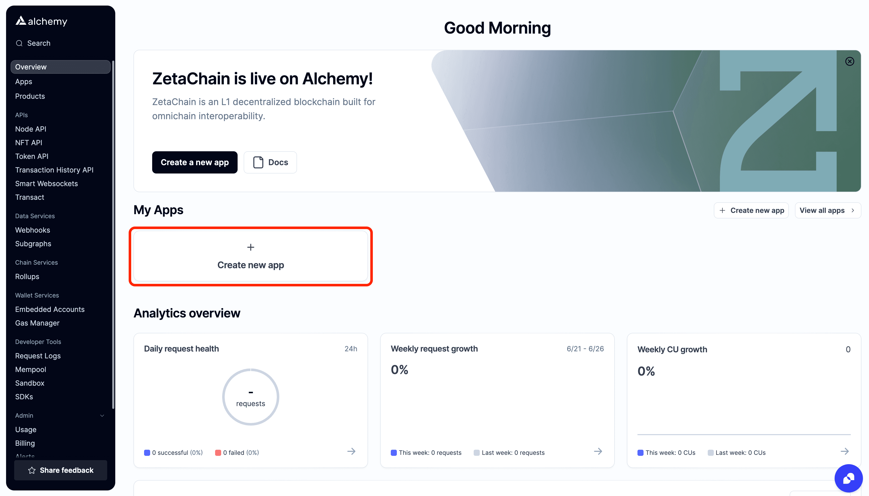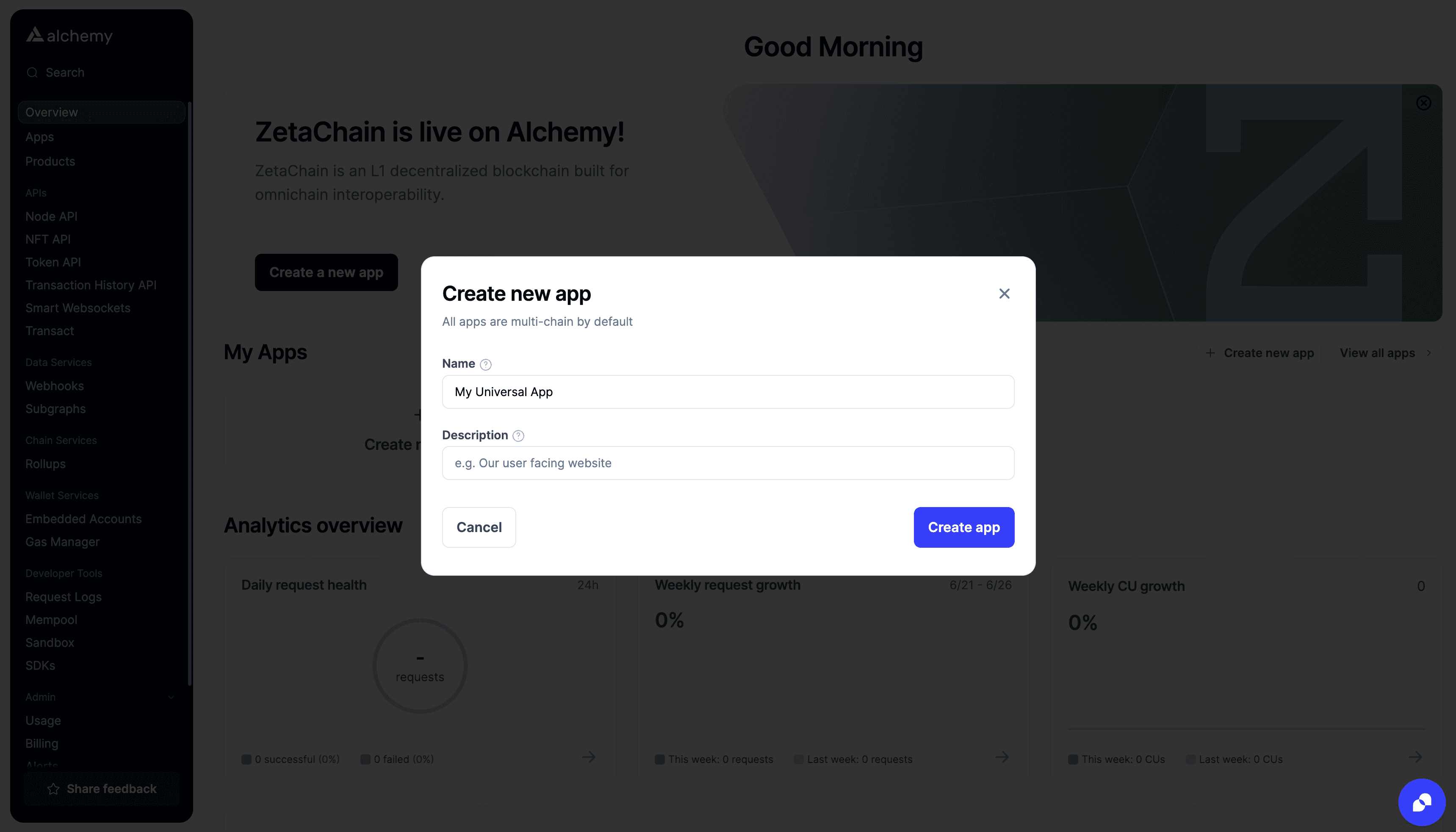 In the Alchemy dashboard you have an overview of all projects currently set up in your account.