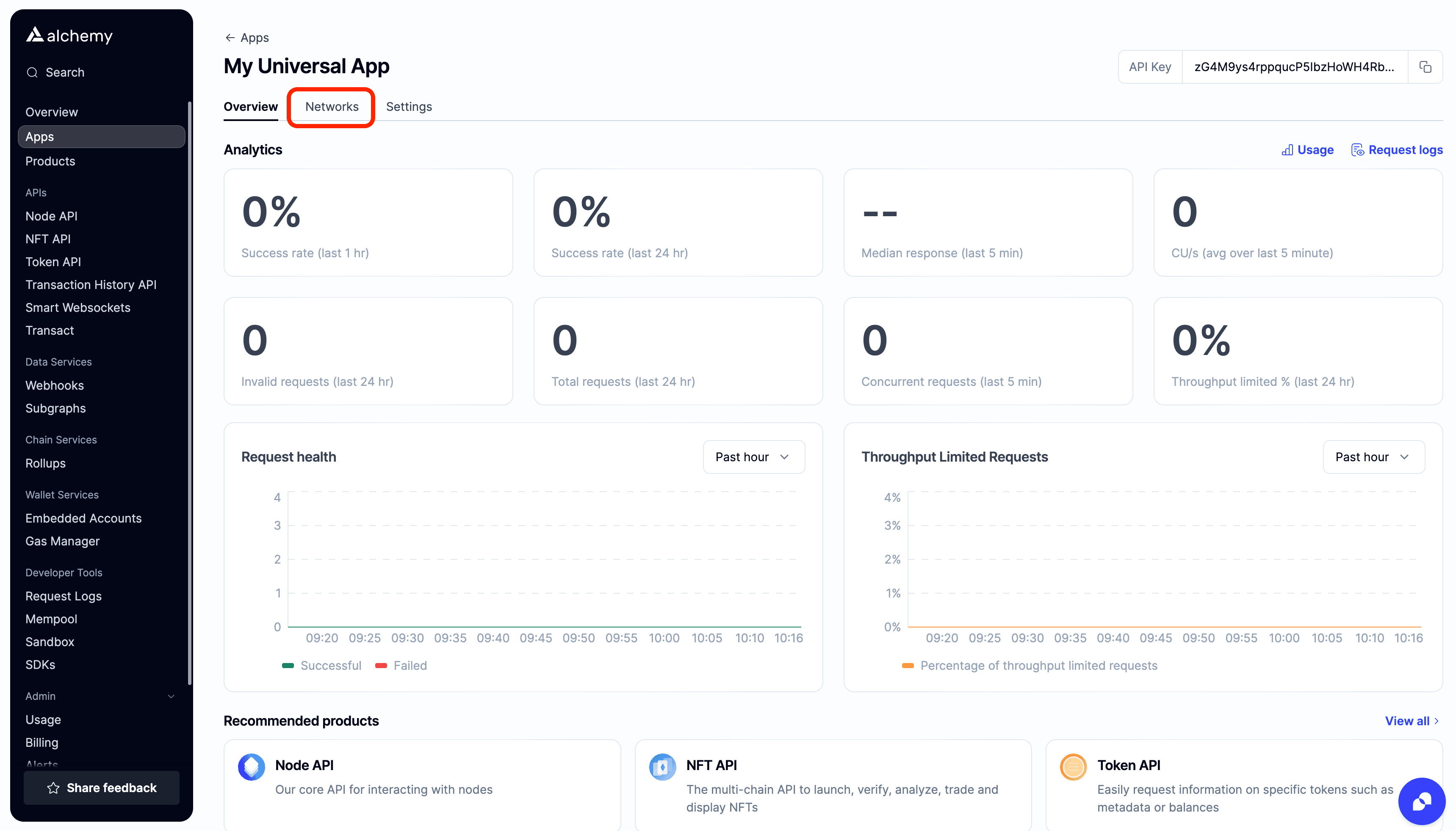 Interactions with your Alchemy RPC instance are protected by an API key. Your API key is automatically generated for you and can be copied from the top-right of your app page.