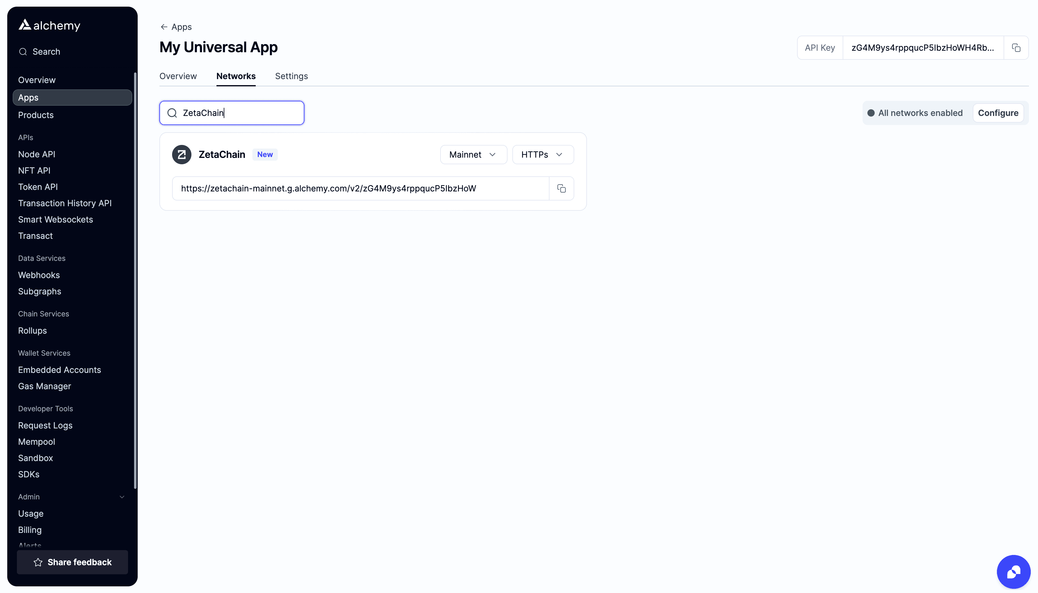 const url = `https://zetachain-mainnet.g.alchemy.com/v2/${YOUR_API_KEY}`;